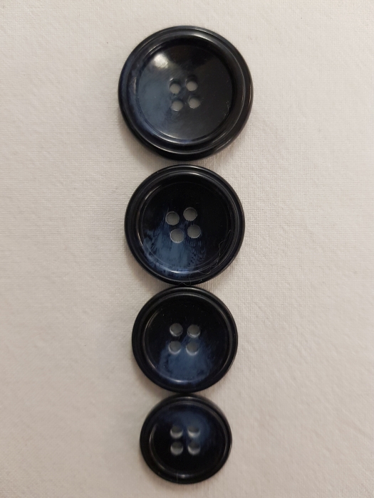 Ein schöner Kunststoffknopf in dunkelblau, meliert mit einem Rand, 4 Loch in den Größen 18/23/25 mm. Diese Knöpfe eignen sich gut für Sakkos und Blazer.