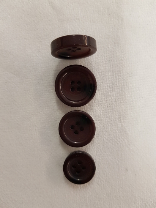 Ein 4 mm dicker Knopf mit Farbverlauf in aubergine - dunkelrot, 4 Loch, in den Größen 18/20/23 mm. Besonders gut geeignet für Strickwaren, Blazer, Sakkos und dickere Stoffe.