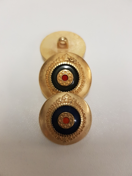 Ein edler Ösenknopf in gold, leicht gewölbt mit dunkelblauen Ring in der Mitte in den Größen 20/23 mm. Geeignet für aller Art von Damen und Herrenbekleidung, insbesonders für dickere Stoffe.