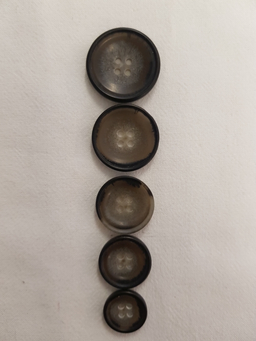 Ein interessanter Hornknopf in grau mit einem schwarzen Rand, 4 Loch in den Größen 16/18/20/22/25 mm. Geiegnet für Damen und Herren Oberbekleidung aller Art.