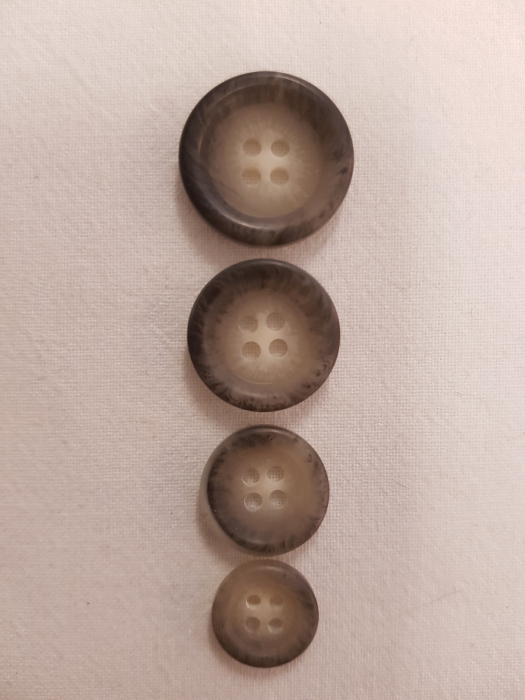 Ein netter 4Lochknopf in grau meliert mit einem Rand in den Größen 13/16/18/20 mm. Besonders gut geeignet für Sakkos, Blazer und Jacken sowie auch für Strickwaren aller Art.