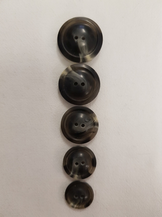 Ein glänzender Kunststoffknopf mit Rand in schwarz-creme meliert, etwas nach innen gewölbt. 2 Loch, in den Größen 18/20/25/28/30mm. Geeignet für Damen & Herren Jacken, Sakkos, Strickjacken, Blazer sowie Mäntel.