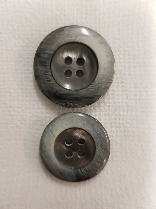 Ein edler Kunststoffknopf in Metallicloock in grau -creme meliert, 4Loch in den Größen 20/25 mm. Geeignet für Blazer, Sakkos, Damen und Herrenbekleidung aller Art.