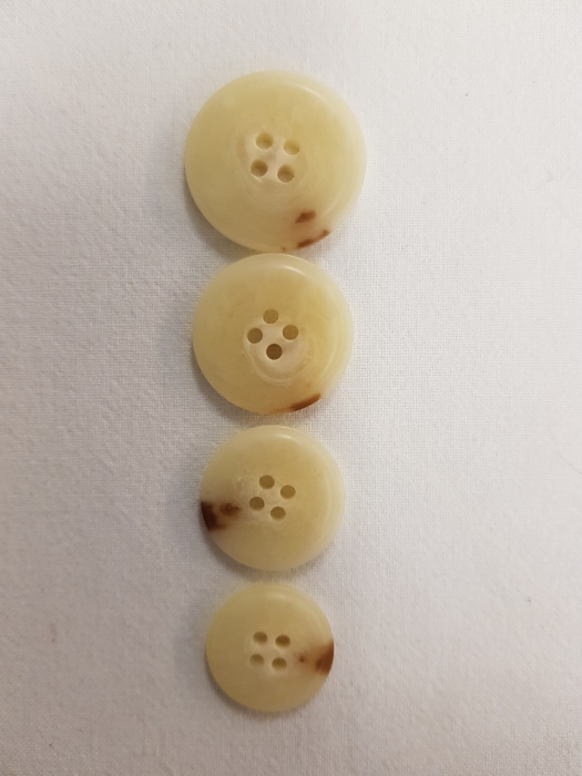Hübscher 4Lochknopf mit einer Vertiefung am Rand in baige-creme meliert in den Größen 16/18/22/25 mm. Geeignet für Blazer, Sakkos, Damen & Herren Jacken aller Art sowie auch für Strickwaren.