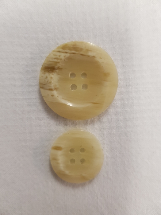 Ein interessanter Kunststoffknopf in cremebeige-meliert, 4 Loch, 18/25mm. Geeignet für Sakkos sowie Damen und Herren Jacken, Blazer.