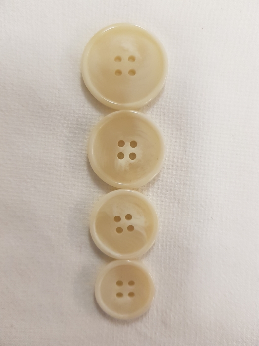 Kunststoffknopf mit Farbverlauf in weiß - creme, glänzend. 4 Loch, 16/18/20/25mm. Geegnet für Blazer, Sakkos, Strickwaren sowie Damen und Herren Oberbekleidung.