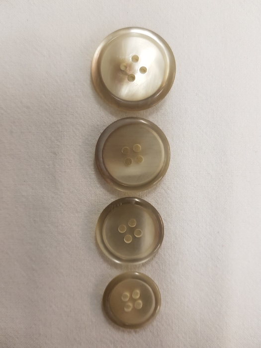 Ein eleganter Kunststoffknopf in Perlmuttoptik in beigegrau-meliert, glänzend, 4 Loch in den Größen 18/20/22/25 mm. Geeignet für Blazer, Sakkos sowie Damen und Herren Bekleidung aller Art