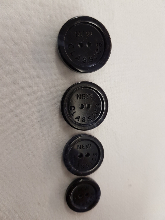 Ein ausgefallener 2 Lochknopf mit Schriftzug in schwarz-meliert, in den Größen 18/20/22/25mm Gut geeignet für Jacken, Blazer, Sakkos sowie Strickwaren alle Art.