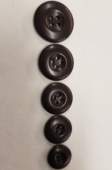 Ein 4 Lochknopf mit breitem Rand in schwarz-glänzend, in den Größen 18/22/25/28mm. Gut geeignet für Mäntel, Jacken, Blazer, Sakkos sowie Strickwaren aller Art.