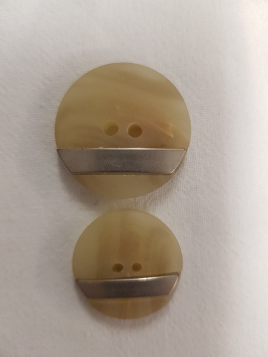 Ein sehr eleganter Knopf mit silbernen Einsatz in grau - beige, 2 Loch, in den Größen 20 und 28mm. Geeignet für Bläzer, Sakkos, Mantel sowie Damen und Herren festlicher Kleidung.