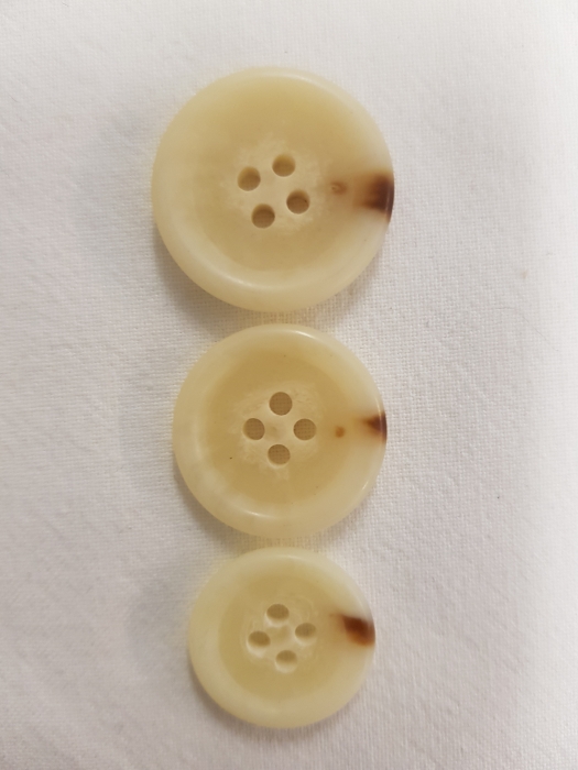 Hornknopf mit einem Rand in creme mit braunen Fleck, 4 Loch 15/18/22mm. Geeignet für Bläzer, Sakkos sowie Damen und Herren Strickwaren.