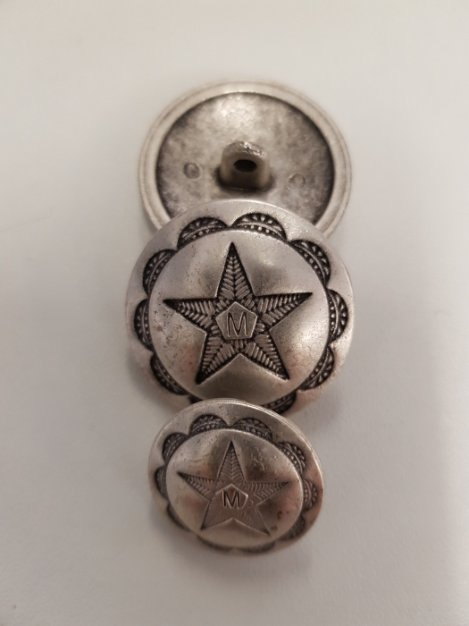 Silberner Metallknopf leicht gewölbt mit Öse und mit einem großen Stern in den Größen 20/28 mm. Besonders gut geeignet für Damen und Herren-Mäntel.