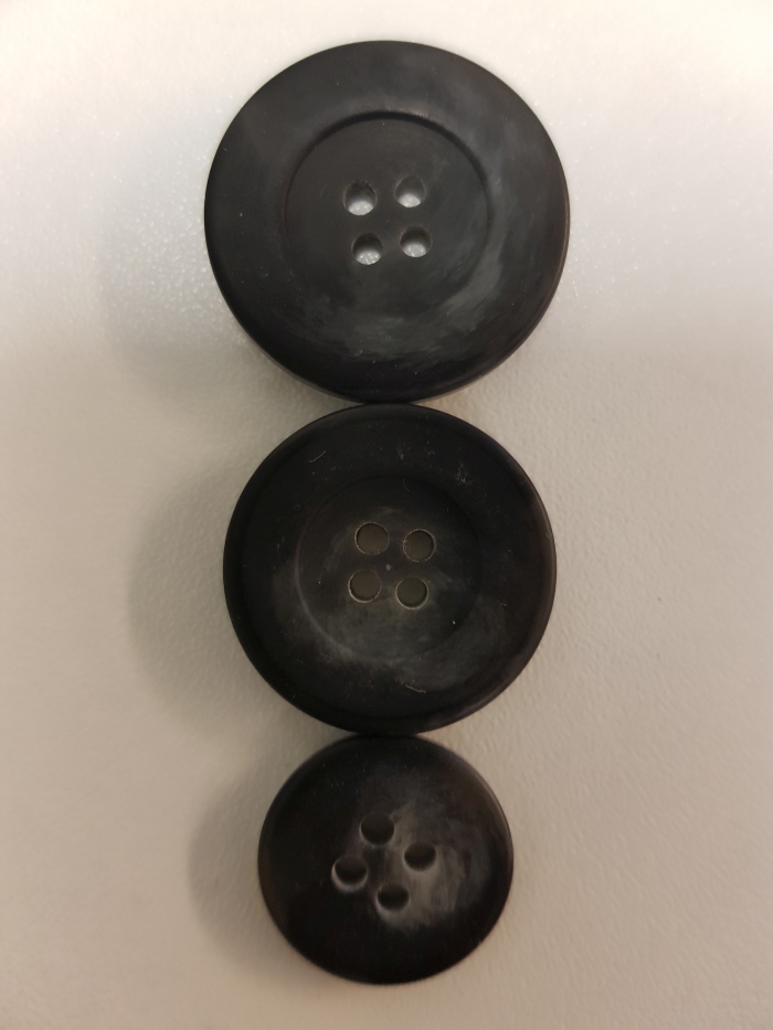Hornknopf in grau-blau, meliert, 4 Loch in den Größen 18/20/25 mm. Diese Knöpfe sind gut geeignet für Sakkos, Blazer aber auch für Mäntel.