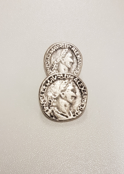 Interessanter Metallknopf mit Öse in silber, ganz flach mit Motiv in den Größen 18 und 22 mm.