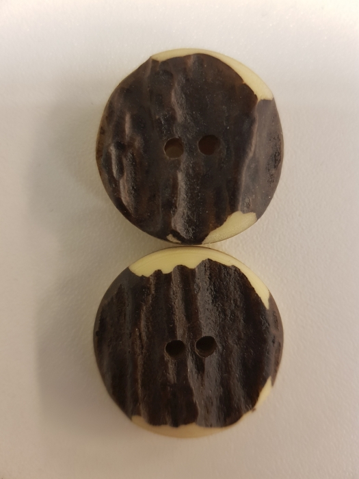Ein klassischer Trachtenknopf aus echtem Horn in braun-beige, 2 Loch in der Größe 25mm. Geeignet für Damen und Herren Trachtenjacken.