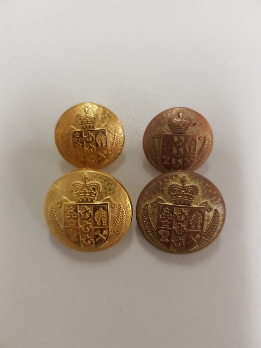 Ein ausgefallener Trachtenknopf in Gold und Kupfer mit Öse aus Metall mit Wappenmotiv in den Größen 18 und 22 mm.