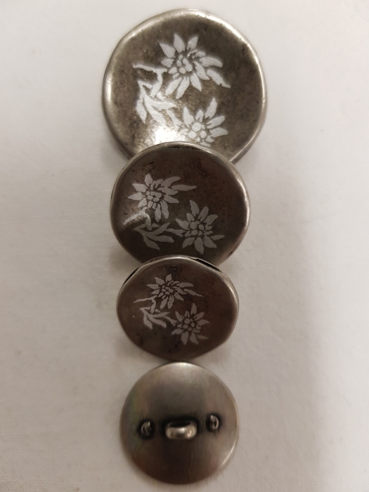 Hübscher Trachtenknopf etwas nach innen gewölbt in antiksilber mit einem Blumenmotiv in den Größen 22/25 mm.