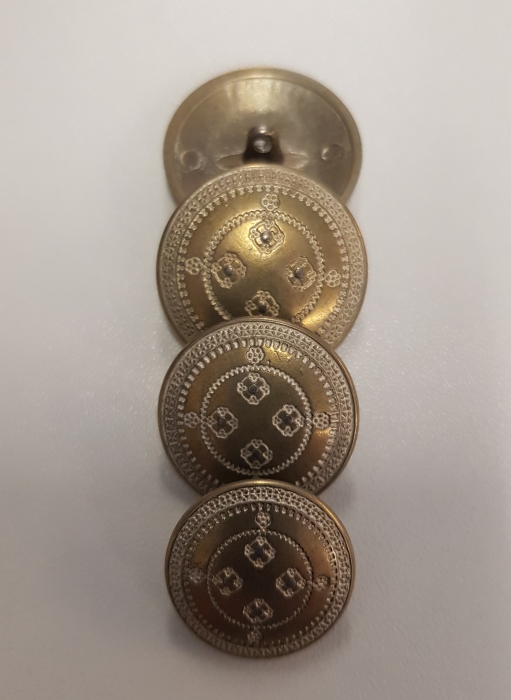 Ein hübscher Metallknopf mit Öse in gold-silber mit einem Muster in den Größen 20/23/25 mm. Geeignet für Trachtenmode aber auch für Blazer und Sakkos.