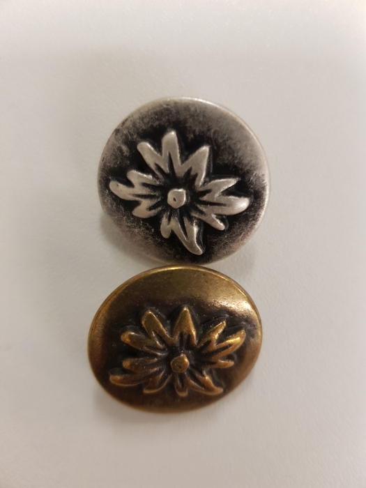 Ösenknopf aus Metall in altsilber und altmessing mit Edelweißmotiv in 22 mm.