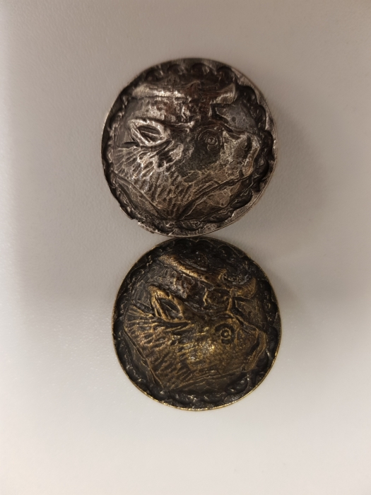 30 mm großer Trachtenknopf aus Metall stark gewölbt mit Öse in altsilber und messing, mit einem interessanten Elchmotiv.