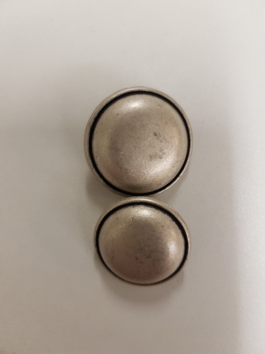 Stark gewölbter Metallknopf mit Öse mit einem schwarzen Rand in silber in den Größen 20 und 25 mm.