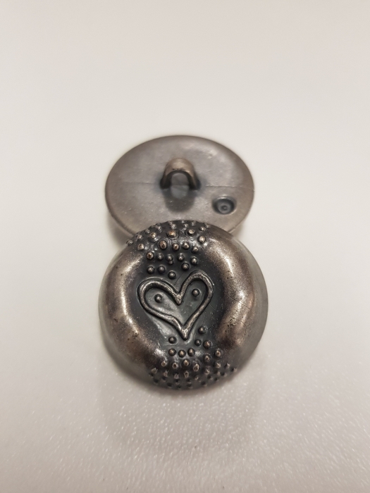 7mm-dicker Knopf in metalloptik mit Öse, zur Mitte nach innen gewölbt mit Herzmotiv in 22 mm.