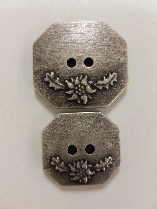 Interessanter 2-Lochtrachtenknopf in altsilber aus Metall mit Edelweismotiv, eckig, in den Größen 20/28 mm.