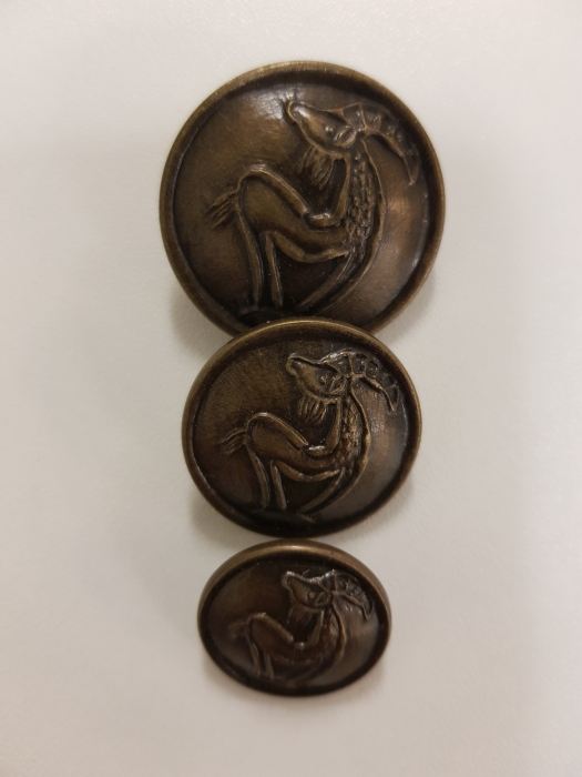 Trachtenknopf aus Kunststoff in Metalloptik mit Öse in silber mit Steinbockmotiv in altmessing, in den Größen 20/25/30 mm.