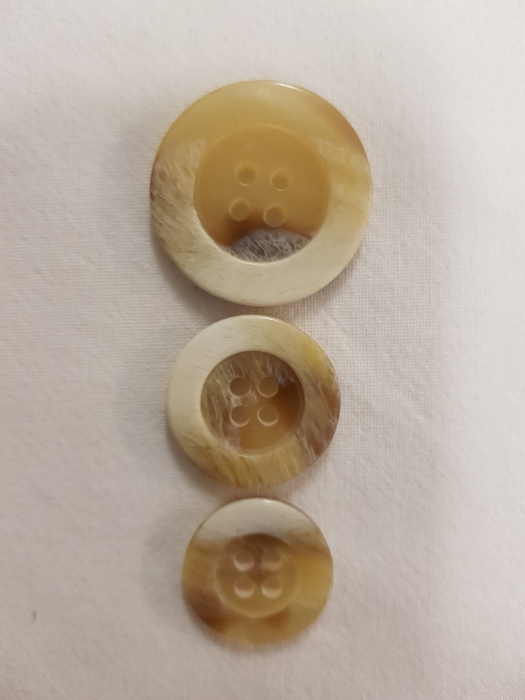 Ein sehr schöner Kunststoffknopf mit Rand in beige - hellbraun -glänzend, meliert. 4 Loch, 18/20/25mm. Gut geeignet für Strickwaren, Blazer, Sakkos sowie für festlicher Kleidung.