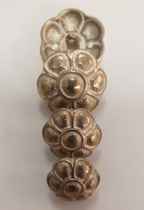 Ein niedlicher Metallknopf in der Form einer Blume in gold-silber mit Öse, in den Größen 16/18/22 mm. Geeignet für Trachtenmode aber auch für andere Kleidungsstücke.