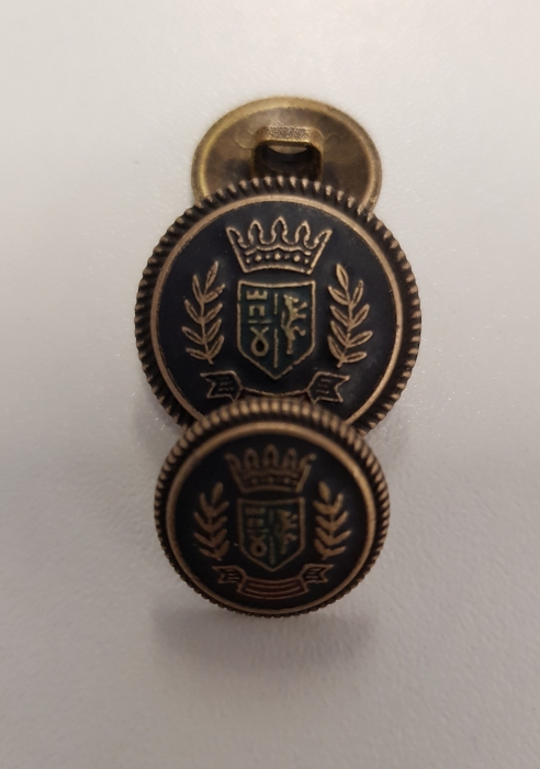 Einzigartiger Ösenknopf aus Metall in messing mit dunkelblau unterlegtem Wappenmotiv in den Größen in den Größen 15/20 mm. Besonders gut geeignet für Blazer, Sakkos, Damen und Herrenoberbekleidung aller Art.