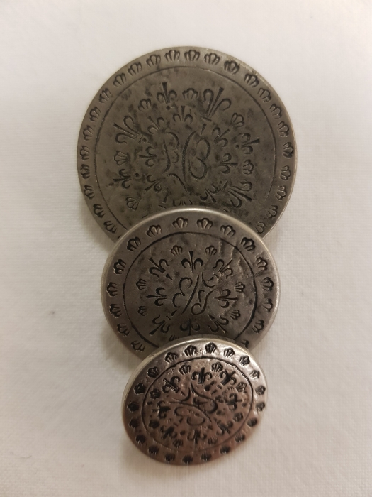 Ein hübscher Metallknopf mit Muster in altsilber mit Öse in den Größen 18/22/30 mm.
