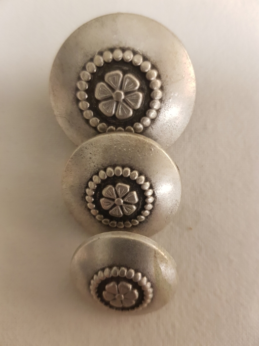 Hübscher Trachtenknopf aus Metall ganz leicht gewölbt mit Öse in altsilber mit einer Blume in den Größen 20/23/28 mm.