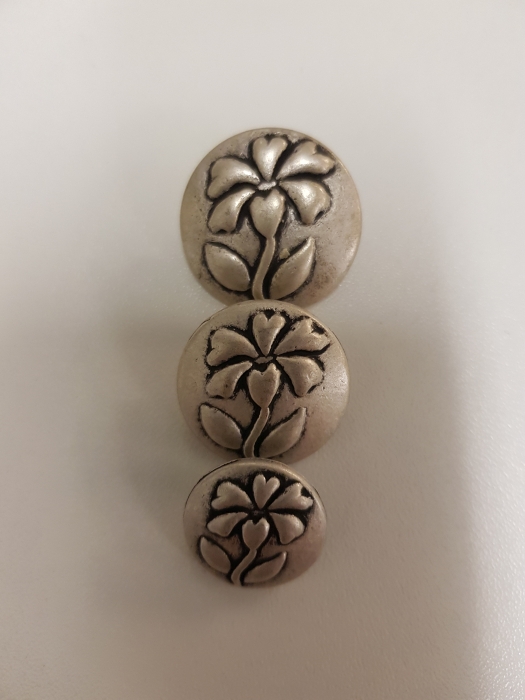 Hübscher Metallknopf mit Öse, ganz leicht gewölbt in silber mit einer Blume als Relief in den Größen 18/23/25 mm